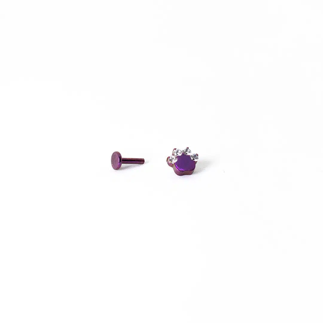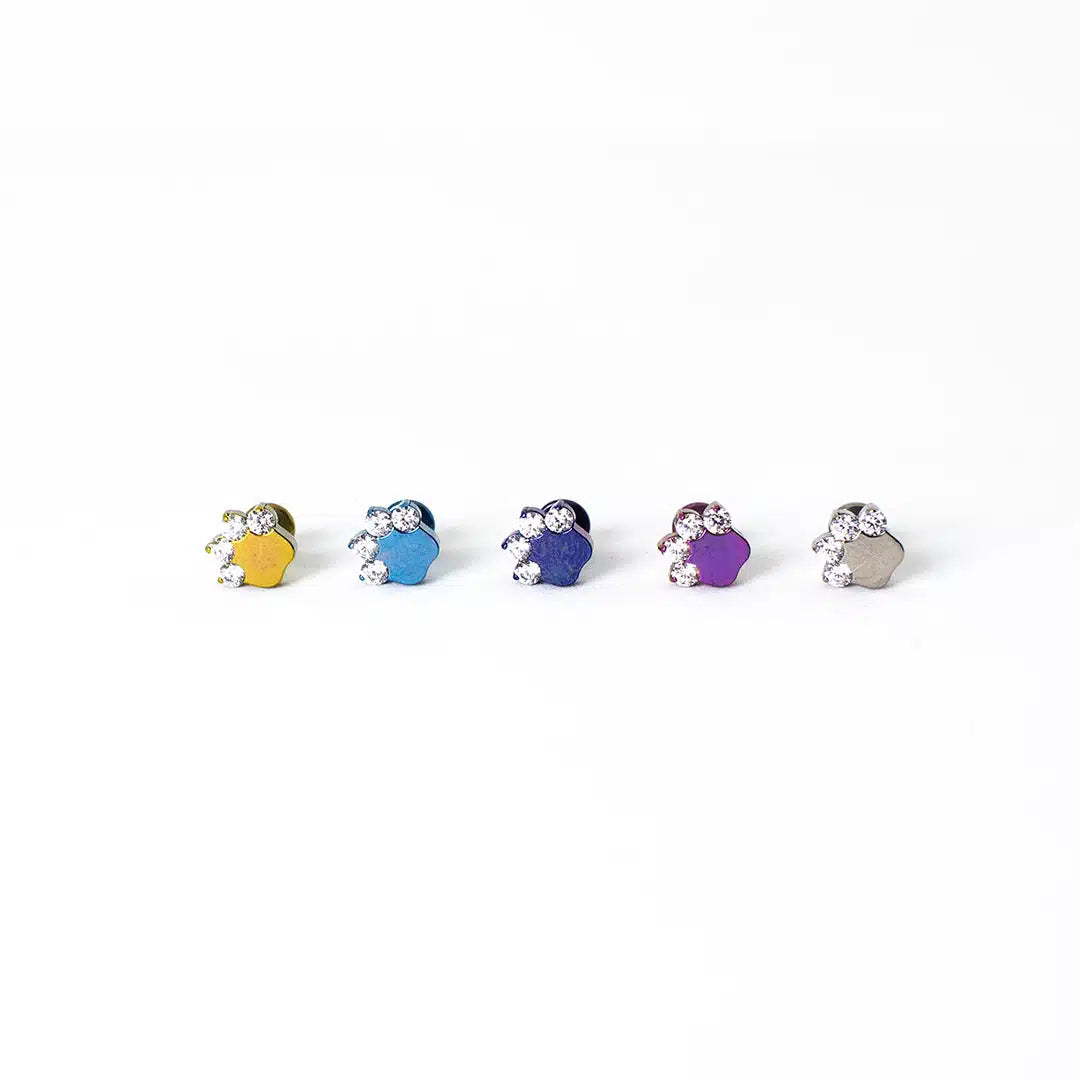 Este sofisticado labret de titanio presenta un diseño exclusivo en forma de huella de mascota, adornado con cuatro circones en los extremos para un toque de brillo y elegancia. Su sistema de rosca interna garantiza un ajuste seguro y cómodo, ideal para diversas perforaciones.