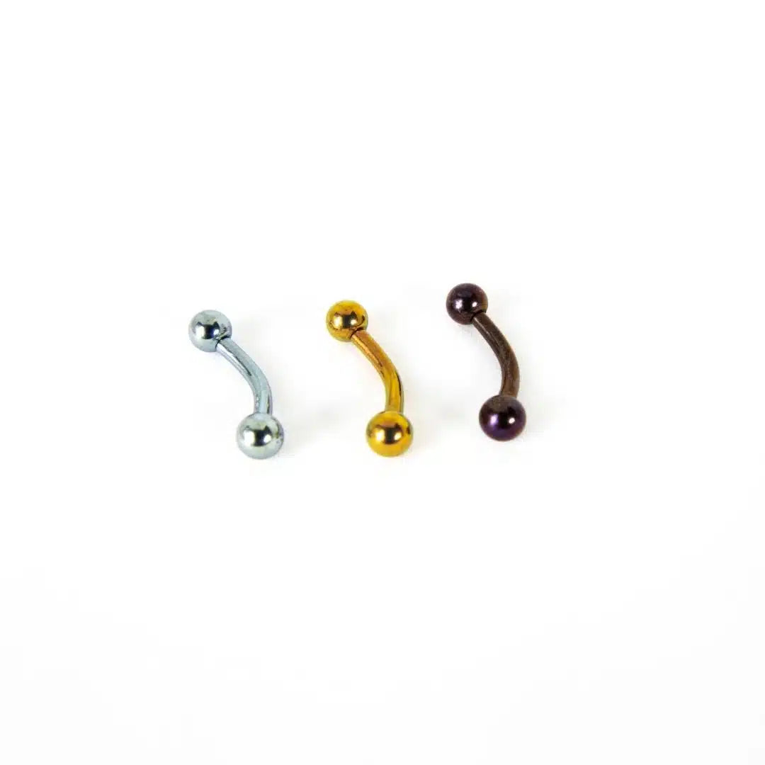 Piercings de alta calidad fabricados en titanio, diseñados con una ligera curvatura en el centro, similar a un barbell corto. Su versatilidad los hace ideales para perforaciones como ceja, daith, puentes en el lóbulo y ombligo.