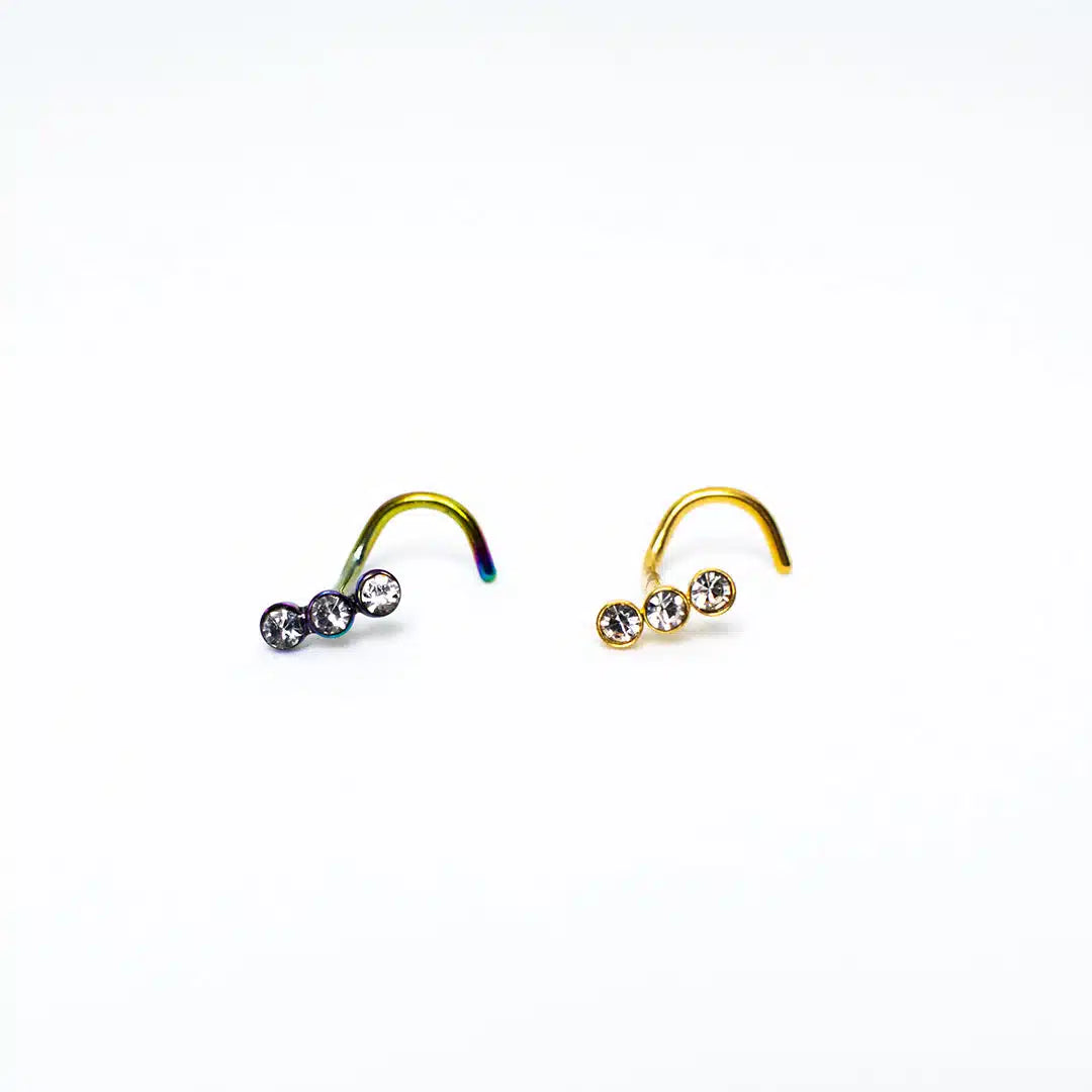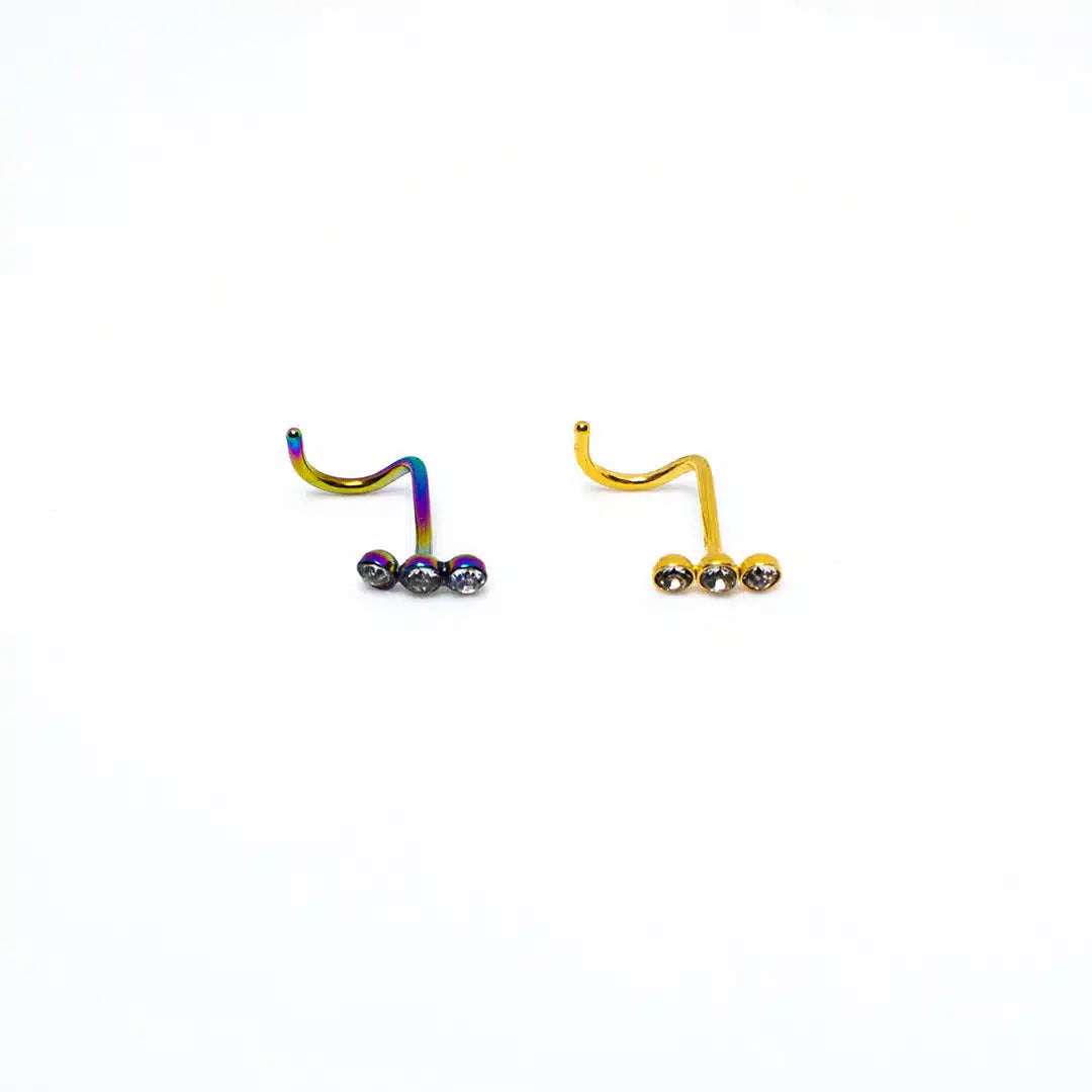 Este sofisticado nostril cuenta con tres circones incrustados de forma consecutiva, aportando un brillo sutil y elegante. Su diseño en espiral garantiza un ajuste seguro, evitando que se caiga fácilmente.