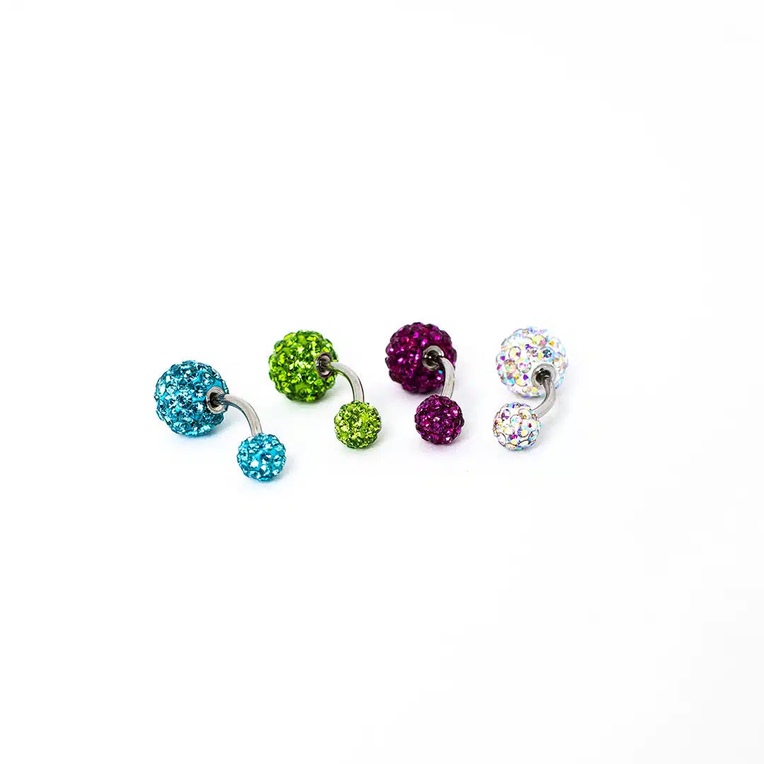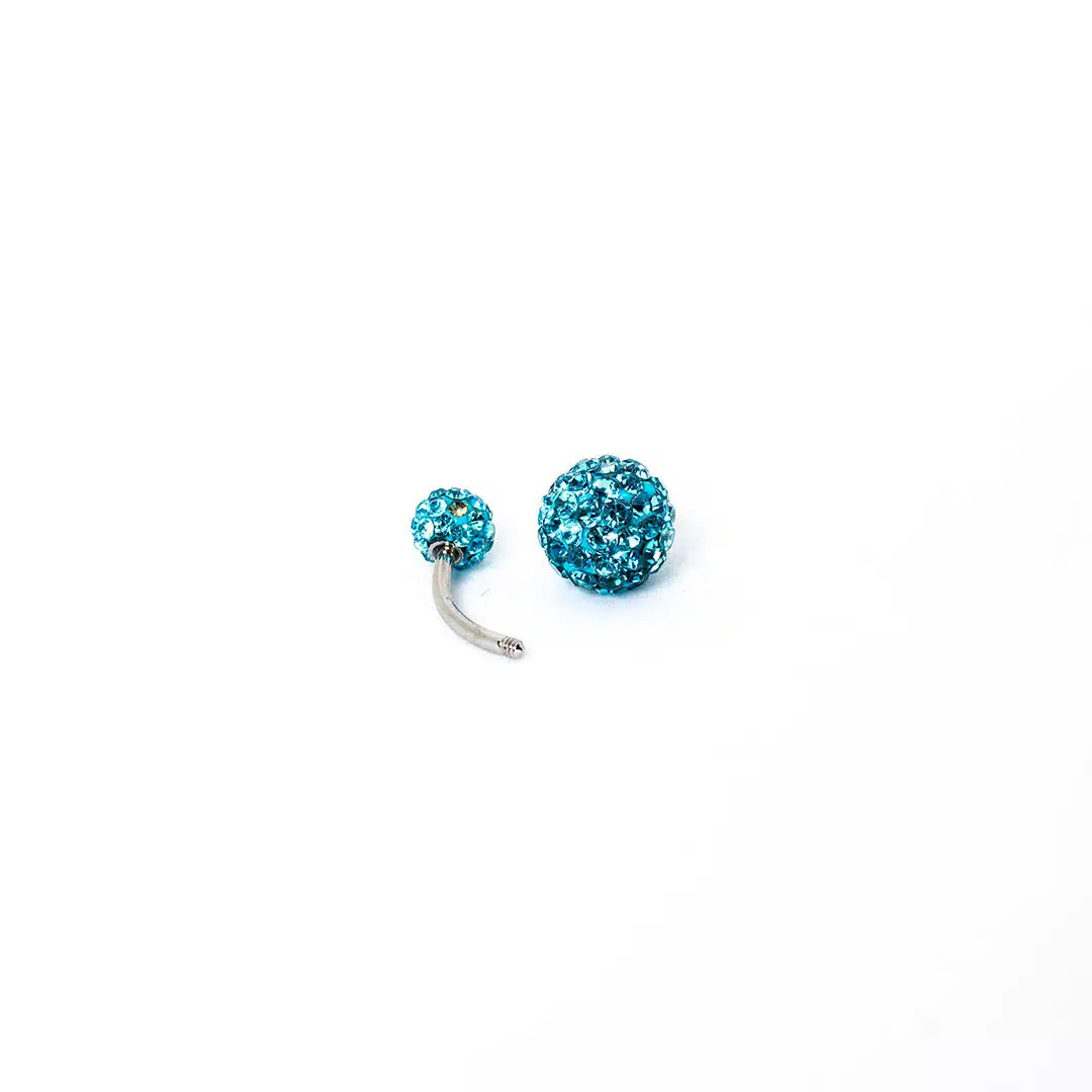 Este exclusivo piercing para ombligo combina un diseño sofisticado con detalles brillantes, evocando el efecto de una bola de fuego. Sus pequeñas brillantinas y engastes en la parte superior e inferior realzan su apariencia lujosa y única.